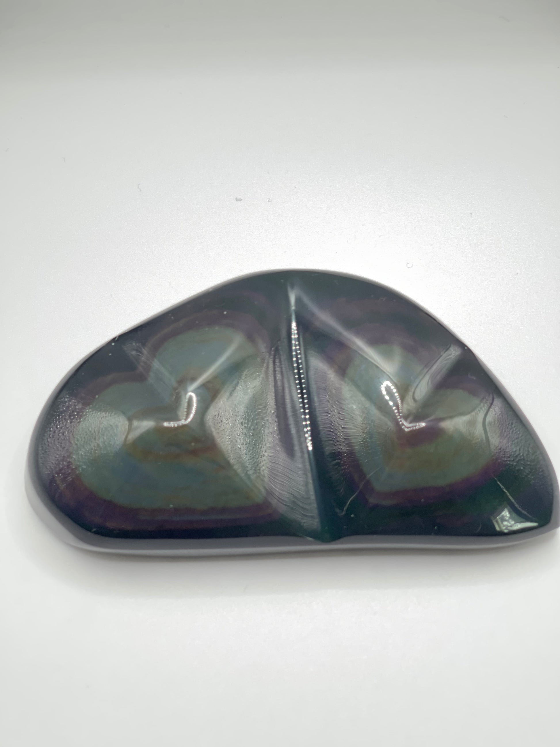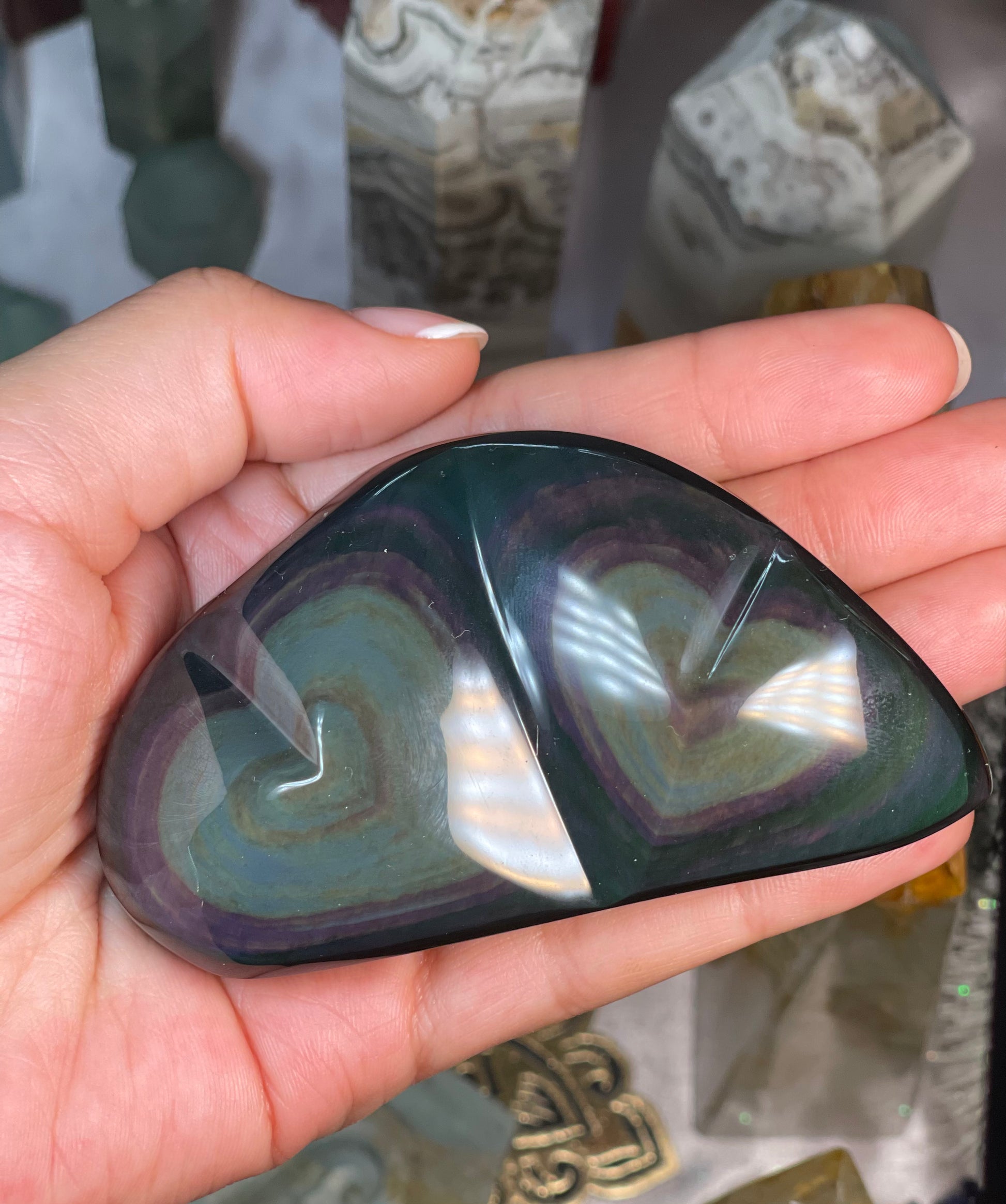 Rainbow Obsidian, also known as "Heavenly Tears," has been valued since ancient times for its powerful protective and healing properties. Aztec and Mayan civilizations used it to carve tools and weapons, believing it could shield them from negative energies and emotional trauma. This Rainbow Obsidian Heart, with its striking bands of iridescent colors, resonates with the Root and Heart Chakras, promoting grounding, protection, and emotional healing. Ideal for meditation, crystal grids, and energy healing, the heart shape enhances the stone's ability to open the heart and provide comfort.
